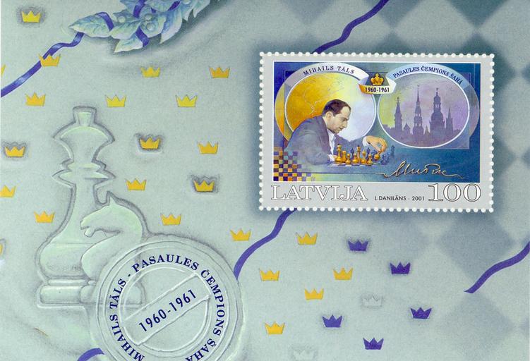 Keywords: 20010818 1lats Latvia Postage Stamp.jpg en Latvian postage stamp commemorating the 40th anniversary of the 1960-1961 world chess champion Mihails Tāls Scan of postage stamp from own collection Philaweb 2010-05-01 PD-LV-exempt stamps <gallery> File 20010818 1lats Latvia Postage Stamp X jpg </gallery> Stamps of Latvia 2001 Miniature sheet of Latvia 2001 Riga on stamps Mikhail Tal on stamps |