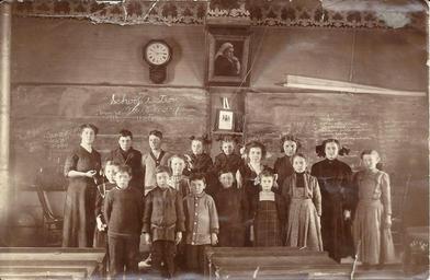 | Keywords: children 1910s women clothes schools Group photograph of Flossie Hall and her students at School Section No. 10, Mariposa, Victoria County. The photograph was taken on March 28, 1912. It shows six boys and ten girls, standing in front of the blackboard of the school. Above their heads is a portrait of Queen Victoria and a clock, showing that the time was 2.50pm. The photograph forms part of the Hall Family fonds, donated to Deseronto Archives by Kathryn Sondheim, Flossie's granddaughter, in 2003. Group photograph of Flossie Hall and her students at School Section No. 10, Mariposa, Victoria County. The photograph was taken on March 28, 1912. It shows six boys and ten girls, standing in front of the blackboard of the school. Above their heads is a portrait of Queen Victoria and a clock, showing that the time was 2.50pm. The photograph forms part of the Hall Family fonds, donated to Deseronto Archives by Kathryn Sondheim, Flossie's granddaughter, in 2003. |