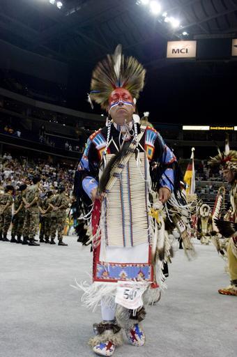 | Keywords: smithsonian institution smithsonianinstitution native american nativeamerican face paint facepaint traditional outfit traditionaloutfit military in background militaryinbackground head dress headdress performance competitor competition indian dance stadium feathers red face paint redfacepaint danzante indio plumas pow wow powwow native americans nativeamericans dancing moving traditional dance traditionaldance national museum of the american indian nationalmuseumoftheamericanindian Description: Powwows are large social gatherings of Native Americans who follow traditional dances started centuries ago by their ancestors, and which continually evolve to include contemporary aspects. These events of drum music,  dancing, singing, artistry and food, are attended by Natives and non-Natives, all of whom join in the dancing and take advantage of the opportunity to see old friends and teach the traditional ways to a younger generation.   During the National Powwow, the audience see dancers in full regalia compete in several dance categories, including Men and Women's Golden Age (ages 50 and older); Men's Fancy Dance, Grass and Traditional (Northern and Southern); Women's Jingle Dress, Fancy Shawl, and Traditional (Northern and Southern); Teens (13-17); Juniors (6-12) and Tiny Tots (ages 5 and younger). The drum groups are the heart of all powwows and provide the pulsating and thunderous beats that accompany a dancer's every movement. The powwow is led by three "host drums" that showcase three distinct styles of singing (Northern, Southern and contemporary) and represent the best examples of each style. The drum contest highlights groups of 10 to 12 members each, and they sing traditional family songs that are passed down orally from one generation to the next. The National Museum of the American Indian sponsored the National Powwow in 2002, 2005, and 2007 as a way of presenting to the public the diversity and social traditions of contemporary Native cultures.  Creator/Photographer: Cynthia Frankenburg  Medium: Digital photograph  Culture: American Indian  Geography: USA  Date: 2005  Repository: National Museum of the American Indian  Accession number: 081405CFPWb052 Description: Powwows are large social gatherings of Native Americans who follow traditional dances started centuries ago by their ancestors, and which continually evolve to include contemporary aspects. These events of drum music,  dancing, singing, artistry and food, are attended by Natives and non-Natives, all of whom join in the dancing and take advantage of the opportunity to see old friends and teach the traditional ways to a younger generation.   During the National Powwow, the audience see dancers in full regalia compete in several dance categories, including Men and Women's Golden Age (ages 50 and older); Men's Fancy Dance, Grass and Traditional (Northern and Southern); Women's Jingle Dress, Fancy Shawl, and Traditional (Northern and Southern); Teens (13-17); Juniors (6-12) and Tiny Tots (ages 5 and younger). The drum groups are the heart of all powwows and provide the pulsating and thunderous beats that accompany a dancer's every movement. The powwow is led by three "host drums" that showcase three distinct styles of singing (Northern, Southern and contemporary) and represent the best examples of each style. The drum contest highlights groups of 10 to 12 members each, and they sing traditional family songs that are passed down orally from one generation to the next. The National Museum of the American Indian sponsored the National Powwow in 2002, 2005, and 2007 as a way of presenting to the public the diversity and social traditions of contemporary Native cultures.  Creator/Photographer: Cynthia Frankenburg  Medium: Digital photograph  Culture: American Indian  Geography: USA  Date: 2005  Repository: National Museum of the American Indian  Accession number: 081405CFPWb052  |
