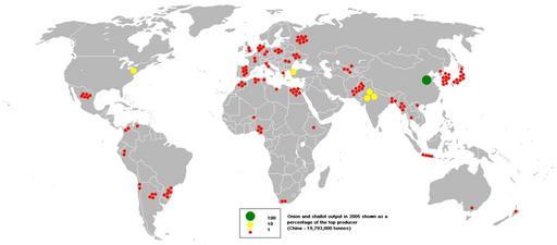 | Keywords: 2005onion and shallot.PNG This bubble map shows the global distribution of onion and shallot output in 2005 as a percentage of the top producer China - 19 793 000 tonnes This map is consistent with incomplete set of data too as long as the top producer is known It resolves the accessibility issues faced by colour-coded maps that may not be properly rendered in old computer screens Data was extracted on 11th June 2007 from http //faostat fao org/site/336/DesktopDefault aspx PageID 336 Based on en Image BlankMap-World png en wikipedia 2007-06-11 Anwar saadat wikipedia en economic map Anwar saadat original upload log page en wikipedia 2005onion_and_shallot PNG 2007-06-11 16 04 Anwar saadat 1425×625×8 62405 bytes <nowiki></nowiki> Agricultural maps of the world Allium cepa Aggregatum Group Allium cepa Onions Bubble maps |
