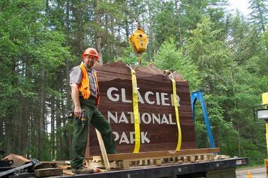 | Keywords: glacier national park glaciernationalpark entrance west entrance westentrance sign dave yeats daveyeats national park service nationalparkservice personnel uniform outdoor Park sign maker Dave Yeats poses with the new west entrance sign he created. The sign features three-dimensional mountains that build up snow as the landscape around them. Photo: David Restivo, NPS. Park sign maker Dave Yeats poses with the new west entrance sign he created. The sign features three-dimensional mountains that build up snow as the landscape around them. Photo: David Restivo, NPS. |