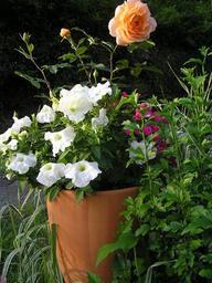 | Keywords: 2007.6.20 ペチュニアとバラの寄せ植え.JPG 2007 6 20 ペチュニアとバラの寄せ植え Terracotta plant pot with large-flowered hybrid rose cultivar and white petunia cultivar between a variegated grass Phalaris arundinacea var picta and hardy hibiscus Hibiscus syriacus not in flower 唐山健志郎 2007-06-20 唐山健志郎 PD White flowers Mixed flowers Apricot roses Petunia × atkinsiana Phalaris arundinacea Hibiscus syriacus |