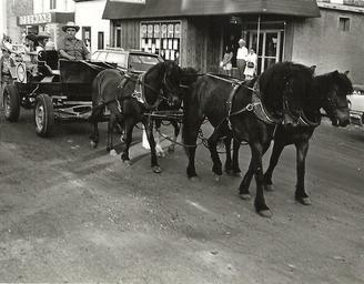 | Keywords: parades horses stores 1970s animal sport riding Photograph of a horse-drawn float in the Centennial Parade held in Deseronto, Ontario, on Thursday, 17th June, 1971. Taken on Main Street, in front of Lyons' grocery store. From a collection of materials relating to the 1971 centennial of Deseronto's incorporation as a village. Photograph believed to have been taken by Lloyd Thompson for The Quinte Scanner. Photograph of a horse-drawn float in the Centennial Parade held in Deseronto, Ontario, on Thursday, 17th June, 1971. Taken on Main Street, in front of Lyons' grocery store. From a collection of materials relating to the 1971 centennial of Deseronto's incorporation as a village. Photograph believed to have been taken by Lloyd Thompson for The Quinte Scanner. |
