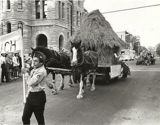 | Keywords: horses parades 1970s tractors outdoor Photograph of horse-drawn float in the Centennial Parade held in Deseronto, Ontario, on Thursday, 17th June, 1971. Taken on Main Street, in front of the Post Office. From a collection of materials relating to the 1971 centennial of Deseronto's incorporation as a village. Photograph believed to have been taken by Lloyd Thompson for The Quinte Scanner. Photograph of horse-drawn float in the Centennial Parade held in Deseronto, Ontario, on Thursday, 17th June, 1971. Taken on Main Street, in front of the Post Office. From a collection of materials relating to the 1971 centennial of Deseronto's incorporation as a village. Photograph believed to have been taken by Lloyd Thompson for The Quinte Scanner. |