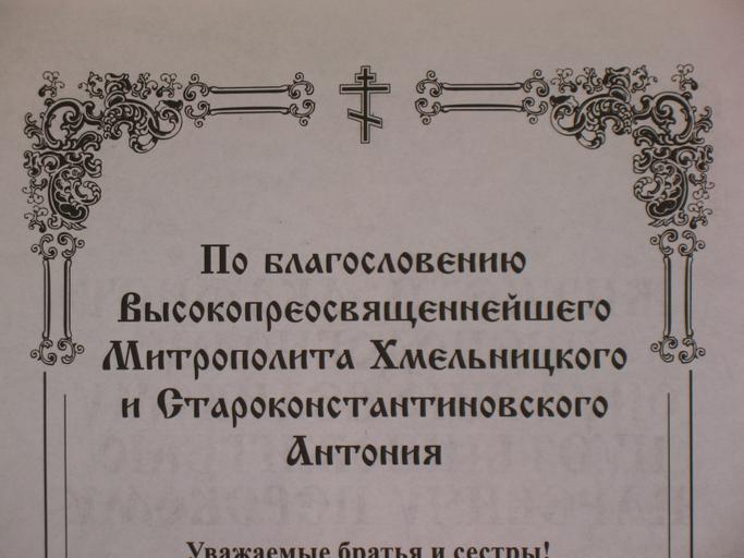 Keywords: Благословение Антония Хмельницкого 2011.JPG Благословение ит ополита Хмельницкого и Ста оконстантиновского Антония УПЦ П Текст станда тный own photo 2011 ит ополит Антоний Фиалко PD-trivial Antony Fialko Blessings in Russian Orthodox Church Religion in Khmelnytsky Oblast
