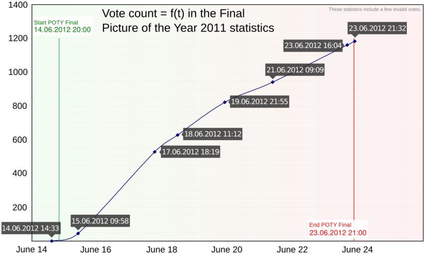 | Keywords: 2012-06-23 POTY R2 stats.svg en Chart vote count f time ; Finalists; POTY 2011 de Diagramm das die Anzahl der abgegebenen Stimmen in der Endrunde POTY2011 auf der Ordinate und das Datum auf der Abszisse zeigt own based on the numbers I collected with <code><nowiki>genStats </nowiki></code> of MediaWiki EnhancedPOTY js Rillke 2012-06-23 Commons statistics EnhancedPOTY Cc-zero |