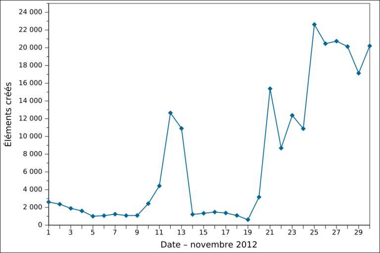 | Keywords: 2012-11 Wikidata item creation FR.svg de Grafische Darstellung des täglichen Anzahls der in November 2012 angelegten Gegenstände auf Wikidata auf Französisch Löschungen werden nicht berücksichtigt en Graph presenting the number of items created daily on Wikidata in November 2012 in French Item deletions are not taken into account fr Graphique en français représentant le nombre d'éléments créés par jour sur Wikidata en novembre 2012 Les suppressions d'éléments ne sont pas prises en compte 2012-12-05 12 45 49 own Ljubinka cc-zero de inline yes File 2012-11 Wikidata item creation DE svg en inline yes File 2012-11 Wikidata item creation EN svg Wikidata statistics in November 2012 Wikidata statistics in French |