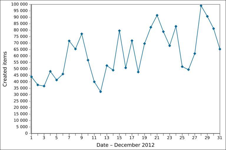 | Keywords: 2012-12 Wikidata item creation EN.svg de Grafische Darstellung des täglichen Anzahls der in Dezember 2012 angelegten Gegenstände auf Wikidata auf Englisch Löschungen werden nicht berücksichtigt en Graph presenting the number of items created daily on Wikidata in December 2012 in English Item deletions are not taken into account fr Graphique en anglais représentant le nombre d'éléments créés par jour sur Wikidata en décembre 2012 Les suppressions d'éléments ne sont pas prises en compte 2013-01-01 16 49 00 own Ljubinka cc-zero de inline yes File 2012-12 Wikidata item creation DE svg fr inline yes File 2012-12 Wikidata item creation FR svg Wikidata statistics in December 2012 Wikidata statistics in English |