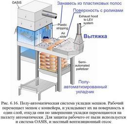 | Keywords: Обеспыливание 2012 Рис. 6.16. Полу-автоматическая система укладки мешков..jpg ru Иллюст ация к учебнику по обеспыливанию п и добыче и пе е аботке полезных мине альных ископаемых глава 6 а Рис 6 16 показана полу-автоматизи ованная система укладки мешков Рабочий защищённый от пыли системой OASIS снимает мешки с конвейе а и укладывает их на абочую пове хность откуда сфо ми ованный слой сг ужается на паллету en Figure 6 16 Semi-automated bag palletizing systems in which a worker removes bags from a conveyor and lifts and positions each layer on an air slide before automated loading onto the pallet Both an OASIS system and an exhaust ventilation system are used to lower the worker s dust exposure during this bag palletizing process 2015-02-06 http //www cdc gov/niosh/mining/works/coversheet1765 html Dust Control Handbook for Industrial Minerals Mining and Processing CDC 2012 Andrew B Cecala Andrew D O Brien Joseph Schall et al other versions Рис 6 16 Полу-автоматическая система укладки мешков Рабочий пе емещает мешок с конвейе а и укладывает их на пове хность в один слой откуда они по заве шении укладки пе емещаются на паллету автоматически Для защиты абочего от пыли используется и система OASIS и местный вентиляционный отсос PD-USGov Workplace safety Uploaded with UploadWizard |