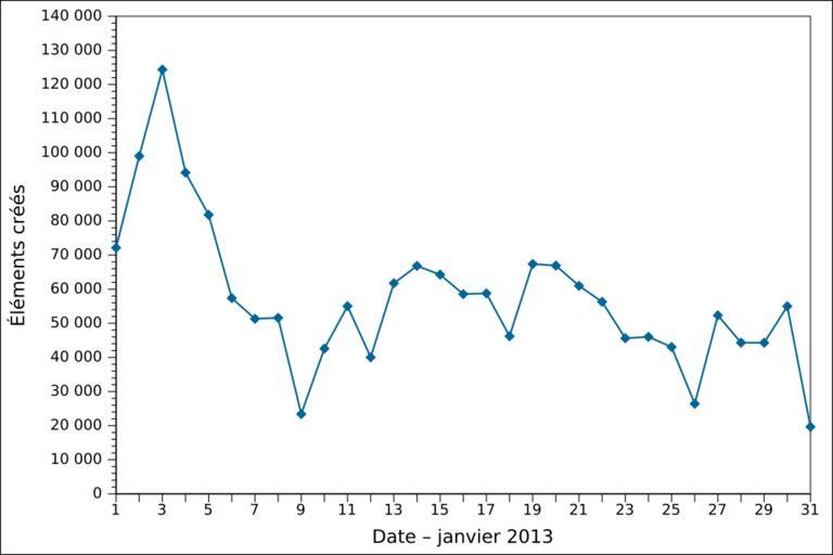 | Keywords: 2013-01 Wikidata item creation FR.svg de Grafische Darstellung des täglichen Anzahls der in Januar 2013 angelegten Gegenstände auf Wikidata auf Französisch Löschungen werden nicht berücksichtigt en Graph presenting the number of items created daily on Wikidata in January 2013 in French Item deletions are not taken into account fr Graphique en français représentant le nombre d'éléments créés par jour sur Wikidata en janvier 2013 Les suppressions d'éléments ne sont pas prises en compte 2013-02-01 16 45 00 own Ljubinka cc-zero de inline yes File 2013-01 Wikidata item creation DE svg en inline yes File 2013-01 Wikidata item creation EN svg Wikidata statistics in January 2013 Wikidata statistics in French |