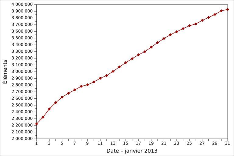 | Keywords: 2013-01 Wikidata items FR.svg de Grafische Darstellung des vollständigen Anzahls der angelegten Gegenstände auf Wikidata in Januar 2013 auf Französisch Löschungen werden nicht berücksichtigt en Graph presenting the total number of items created on Wikidata as of January 2013 in French Item deletions are not taken into account fr Graphique en français représentant le nombre total d'éléments créés sur Wikidata en janvier 2013 Les suppressions d'éléments ne sont pas prises en compte 2013-02-01 16 44 00 own Ljubinka cc-zero de inline yes File 2013-01 Wikidata items DE svg en inline yes File 2013-01 Wikidata items EN svg Wikidata statistics in January 2013 Wikidata statistics in French |