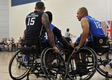 | Keywords: 2013 Warrior Games Wheelchair Basketball 130414-N-DT940-507.jpg en Team Navy/Coast Guard member retired Aviation Electrician's Mate Steven Davis of Turlock Calif blocks opposing team members in a wheelchair basketball game against Team Air Force during the 2013 Warrior Games May 14 The Warrior Games includes competitions in archery cycling seated volleyball shooting swimming track and field and wheelchair basketball The goal of the Warrior Games is not necessarily to identify the most skilled athletes but rather to demonstrate the incredible potential of wounded warriors through competitive sports More than 200 wounded ill or injured service members from the U S and U K armed forces are scheduled to compete in the Paralympics-style competition May 11-16 U S Navy photo by Mass Communication Specialist 1st Class Erica R Gardner/Released 2013-05-14 Petty Officer 1st Class Erica R Gardner https //www dvidshub net/image/932384 130414-N-DT940-507 2013-05-15 13 53 COLORADO SPRINGS CO US PD-USGov-Military-Navy 2013 Warrior Games Images from DoD uploaded by Fæ |