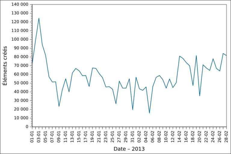 | Keywords: 2013 Wikidata item creation FR.svg de Grafische Darstellung des täglichen Anzahls der im Jahr 2013 angelegten Gegenstände auf Wikidata auf Französisch Löschungen werden nicht berücksichtigt en Graph presenting the number of items created daily on Wikidata in 2013 in French Item deletions are not taken into account fr Graphique en français représentant le nombre d'éléments créés par jour sur Wikidata en 2013 Les suppressions d'éléments ne sont pas prises en compte 2013-03-01 16 27 11 own Ljubinka cc-zero de yes File 2013 Wikidata item creation DE svg en yes File 2013 Wikidata item creation EN svg Wikidata statistics in 2013 Wikidata statistics in French |