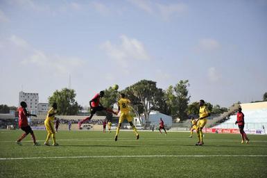 | Keywords: outdoor sport outdoor sport Players tussle for the ball during a game between Elman and Horseed football clubs at Banadir Stadium. This was during the opening match of the Somali premier league's new season in Abdiaziz district of the capital Mogadishu on December 19, 2014. Sports in Somalia is recovering attracting foreign players as a result of the relative peace and progress witnessed in the country. AMISOM Photo / Ilyas Ahmed Players tussle for the ball during a game between Elman and Horseed football clubs at Banadir Stadium. This was during the opening match of the Somali premier league's new season in Abdiaziz district of the capital Mogadishu on December 19, 2014. Sports in Somalia is recovering attracting foreign players as a result of the relative peace and progress witnessed in the country. AMISOM Photo / Ilyas Ahmed 2014 12 19 Somali Football-20 (16145412865).jpg en Players tussle for the ball during a game between Elman and Horseed football clubs at Banadir Stadium This was during the opening match of the Somali premier league's new season in Abdiaziz district of the capital Mogadishu on December 19 2014 Sports in Somalia is recovering attracting foreign players as a result of the relative peace and progress witnessed in the country AMISOM Photo / Ilyas Ahmed 2014-12-19 16 13 36 https //www flickr com/photos/au_unistphotostream/16145412865/ Flickr en AMISOM Public Information AMISOM Public Information https //flickr com/photos/61765479 N08/16145412865 2015-11-28 08 58 00 cc-zero cc-0 Photographs by the African Union Mission to Somalia Sports in Somalia Players tussle for the ball during a game between Elman and Horseed football clubs at Banadir Stadium. This was during the opening match of the Somali premier league's new season in Abdiaziz district of the capital Mogadishu on December 19, 2014. Sports in Somalia is recovering attracting foreign players as a result of the relative peace and progress witnessed in the country. AMISOM Photo / Ilyas Ahmed |