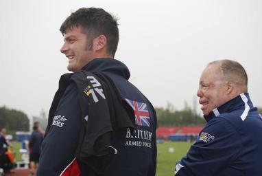 | Keywords: 2014 Invictus Games 140911-N-YY886-001.jpg en U S Air Force Tech Sgt Israel Del Toro and British Armed Forces team captain David Henson engaged in friendly banter during the track and field competition as part of the inaugural Invictus Games an international sporting event for wounded warriors to inspire recovery support rehabilitation and generate a wider understanding and respect for those who serve their countries Del Toro was part of the US team includes 98 military athletes 22 from the Army 20 from the Marine Corps 22 from the Navy 22 from the Air Force and 12 from U S Special Operations Command USSOCOM Inspired by the U S Warrior Games Prince Harry and the Royal Foundation Invictus Games hosted this international sports competition involving cycling swimming track field archery wheelchair rugby sitting volleyball wheelchair basketball and indoor rowing and powerlifting In total nearly 400 athletes from 13 nations participated in the games 2014-09-10 Lt Cmdr Li Cohen https //www dvidshub net/image/1555589 140911-N-YY886-001 2014-09-18 11 28 LONDON GTL GB PD-USGov-Military-Navy Prince Harry of Wales Wounded Warrior 2014 Invictus Games Images from DoD uploaded by Fæ |