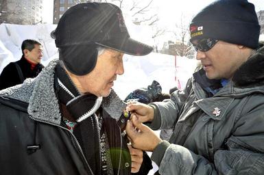| Keywords: 2014 Navy Misawa Snow Team at 65th Annual Sapporo Snow Festival 140206-N-ZI955-129.jpg en Chief Builder Billy Harger helps an elderly man place a Commander Naval Forces Japan lapel pin on his jacket during the 65th Annual Sapporo Snow Festival Feb 6 2014 Harger is the team leader of the 2014 Navy Misawa Snow Sculpture Team which is on Hokkaido Island Japan taking part in the festival The team sculpted a frosty 3-D version of the U S Navy Seabee's Fighting Bee logo This is the 31st year that Naval Air Facility Misawa and its tenant commands have sent a delegation of sailors to Sapporo to create a sculpture and to serve as U S Navy goodwill ambassadors The festival draws about two million spectators each year U S Navy photo by Senior Chief Mass Communication Specialist Daniel Sanford/Released <br>Unit Naval Air Facility Misawa 2014-02-06 Senior Chief Petty Officer Daniel Sanford https //www dvidshub net/image/1162158/2014-navy-misawa-snow-team-65th-annual-sapporo-snow-festival 140206-N-ZI955-129 2014-02-06 03 31 SAPPORO HOKKAIDO JP PD-USGov-Military-Navy Naval Air Facility Misawa Images from DoD uploaded by Fæ |