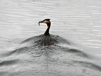 Keywords: 20150819 Fuut met vis.jpg Fuut met vis in de Soestwetering op het punt waar het Almelose kanaal de Soestwetering en de Nieuwe Wetering samenvloeien own 2015-08-19 Gouwenaar Podiceps cristatus eating Soestwetering Cc-zero