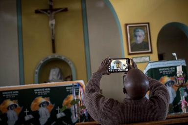 Keywords: kenya nyeri africa roman catholic italy nun sister irene stefani sainthood missionary world war one beatification ceremony soldiers wounded tourism christian nuns faith religion indoor KENYA, Nyeri: In a photograph taken 21 May 2015, and made available by Make It Kenya, a man takes a photograph on a mobile device inside a church ahead of Kenya and Africa's first Roman Catholic beatification ceremony. Final preparations are being made to host thousands of worshippers, officials and visitors who are expected to congregate 23 May for the event in the town of Nyeri approx. 150 kilometers north of the Kenyan capital Nairobi. The ceremony is a critical step towards sainthood for Irene Stefani, an Italian nun and missionary who is beloved in Nyeri and its environs for her selfless service to wounded World War One soldiers and ailing locals alike. Sister Stefani arrived in Kenya in 1915 and gained fame over the following years for her generosity and extraordinary empathy. She died in 1930 after contracting plague. MANDATORY CREDIT: MAKE IT KENYA PHOTO / STUART PRICE. KENYA, Nyeri: In a photograph taken 21 May 2015, and made available by Make It Kenya, a man takes a photograph on a mobile device inside a church ahead of Kenya and Africa's first Roman Catholic beatification ceremony. Final preparations are being made to host thousands of worshippers, officials and visitors who are expected to congregate 23 May for the event in the town of Nyeri approx. 150 kilometers north of the Kenyan capital Nairobi. The ceremony is a critical step towards sainthood for Irene Stefani, an Italian nun and missionary who is beloved in Nyeri and its environs for her selfless service to wounded World War One soldiers and ailing locals alike. Sister Stefani arrived in Kenya in 1915 and gained fame over the following years for her generosity and extraordinary empathy. She died in 1930 after contracting plague. MANDATORY CREDIT: MAKE IT KENYA PHOTO / STUART PRICE.