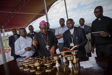 | Keywords: kenya nyeri africa roman catholic italy nun sister irene stefani sainthood missionary world war one beatification ceremony soldiers wounded tourism christian nuns faith religion KENYA, Nyeri: In a photograph taken 21 May 2015, and made available by Make It Kenya, Archbishop Peter Kairo (centre) from Nyeri diocese blesses ceremonial chalices during a rehersal for Africa's first Roman Catholic beatification ceremony. Final preparations are being made to host thousands of worshippers, officials and visitors who are expected to congregate 23 May for the event in the town of Nyeri approx. 150 kilometers north of the Kenyan capital Nairobi. The ceremony is a critical step towards sainthood for Irene Stefani, an Italian nun and missionary who is beloved in Nyeri and its environs for her selfless service to wounded World War One soldiers and ailing locals alike. Sister Stefani arrived in Kenya in 1915 and gained fame over the following years for her generosity and extraordinary empathy. She died in 1930 after contracting plague. MANDATORY CREDIT: MAKE IT KENYA PHOTO / STUART PRICE. KENYA, Nyeri: In a photograph taken 21 May 2015, and made available by Make It Kenya, Archbishop Peter Kairo (centre) from Nyeri diocese blesses ceremonial chalices during a rehersal for Africa's first Roman Catholic beatification ceremony. Final preparations are being made to host thousands of worshippers, officials and visitors who are expected to congregate 23 May for the event in the town of Nyeri approx. 150 kilometers north of the Kenyan capital Nairobi. The ceremony is a critical step towards sainthood for Irene Stefani, an Italian nun and missionary who is beloved in Nyeri and its environs for her selfless service to wounded World War One soldiers and ailing locals alike. Sister Stefani arrived in Kenya in 1915 and gained fame over the following years for her generosity and extraordinary empathy. She died in 1930 after contracting plague. MANDATORY CREDIT: MAKE IT KENYA PHOTO / STUART PRICE. |