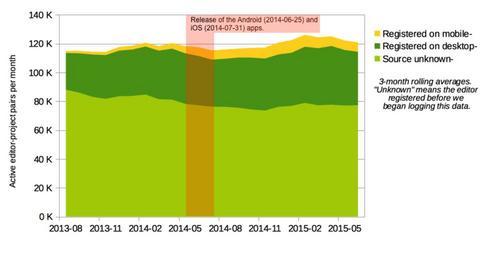 | Keywords: 2015-05 Wikimedia active project-editors by platform.png en A graph of monthly active editors ‰¥ 5 edits across all Wikimedia projects broken down by registration platform desktop mobile or unknown Editors are not deduplicated across projects; for example if an editor is active on both the Spanish Wikipedia and Commons in a given month they will be counted twice 2015-07-16 own Neil P Quinn-WMF other versions cc-zero Uploaded with UploadWizard Uncategorized 2015 September 11 | ||||