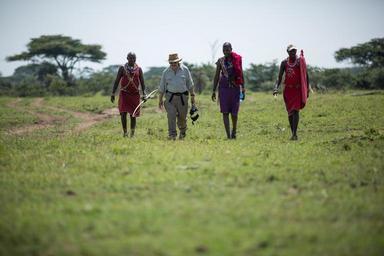 Keywords: kenya maasai mara national reserve ol kinyei porini gamewatchers wildlife management nature conservation environment conservancy employment community guide tracker tourism tourists safari holiday outdoor KENYA, Ol Kinyei, Maasai Mara: In a photograph taken by Make It Kenya 15 June 2015, Phil Edwards, a repeat, yearly vistor to Porini Mara Camp in the Ol Kinyei Conservancy in Kenya's Maasai Mara, walks with Maasai guides during a walking safari. The management of Ol Kinyei and similar conservancies bordering the Maasai Mara National Reserve and in other areas of Kenya is an alternative approach to wildlife conservation. The land on which the conservancies are located is leased from local communities who directly benefit from its use to naturally host and protect wildlife populations. The privately owned and managed conservancies also offer employment to members of these communities and further opportunity of training in different areas of expertise from guides and trackers to chefs and camp management. Strict regulation of visitor numbers and the construction of camps inside the conservancies also limit the amount of people and vehicles present at any given time, offering tourists a much more personal and exclusive wildlife safari experience while at the same time reducing stress on and the disturbance of wildlife populations, which quickly begin to return and repopulate areas and land transformed under the conservancy model. MANDATORY CREDIT: MAKE IT KENYA PHOTO / STUART PRICE. KENYA, Ol Kinyei, Maasai Mara: In a photograph taken by Make It Kenya 15 June 2015, Phil Edwards, a repeat, yearly vistor to Porini Mara Camp in the Ol Kinyei Conservancy in Kenya's Maasai Mara, walks with Maasai guides during a walking safari. The management of Ol Kinyei and similar conservancies bordering the Maasai Mara National Reserve and in other areas of Kenya is an alternative approach to wildlife conservation. The land on which the conservancies are located is leased from local communities who directly benefit from its use to naturally host and protect wildlife populations. The privately owned and managed conservancies also offer employment to members of these communities and further opportunity of training in different areas of expertise from guides and trackers to chefs and camp management. Strict regulation of visitor numbers and the construction of camps inside the conservancies also limit the amount of people and vehicles present at any given time, offering tourists a much more personal and exclusive wildlife safari experience while at the same time reducing stress on and the disturbance of wildlife populations, which quickly begin to return and repopulate areas and land transformed under the conservancy model. MANDATORY CREDIT: MAKE IT KENYA PHOTO / STUART PRICE.