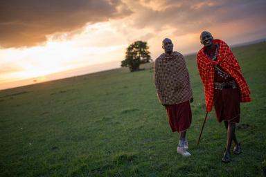 Keywords: kenya travel tourism culture tradition maasai mara national reserve north conservancy wildlife conservation walking village manyatta traditional contemporary lifestyles modern world 21st century change development outdoor KENYA, Maasai Mara: In a photograph taken by Make It Kenya 23 June 2015, Josphat Mako (right) Maasai guide and companion to author and travel writer Stuart Butler, stands with a Maasai companion known as Lemeria as the sun begins to set over the Mara North Conservancy adjacent to Kenya's world famous Maasai Mara National Reserve. Throughout the months of May and June, Stuart and Mako walked over 200km across traditional lands belonging to Kenya's Maasai. Embarking from the high, remote and forested Loita Hills they headed west, skirting the edge of the world famous Maasai Mara National Reserve, passing through private and community conservancies before finishing at the foot of the Oloololo Escarpment. During the expedition, Stuart and Mako visited numerous Maasai villages known as manyattas spending time with both past and present generations of Maasai people, learning about their traditional cultures and contemporary Maasai lifestyles, and the pressure of the modern world and the 21st Century, conservation, political pressures and tourism, all of which influence and contribute to Maasai life today. MANDATORY CREDIT: MAKE IT KENYA PHOTO / STUART PRICE. KENYA, Maasai Mara: In a photograph taken by Make It Kenya 23 June 2015, Josphat Mako (right) Maasai guide and companion to author and travel writer Stuart Butler, stands with a Maasai companion known as Lemeria as the sun begins to set over the Mara North Conservancy adjacent to Kenya's world famous Maasai Mara National Reserve. Throughout the months of May and June, Stuart and Mako walked over 200km across traditional lands belonging to Kenya's Maasai. Embarking from the high, remote and forested Loita Hills they headed west, skirting the edge of the world famous Maasai Mara National Reserve, passing through private and community conservancies before finishing at the foot of the Oloololo Escarpment. During the expedition, Stuart and Mako visited numerous Maasai villages known as manyattas spending time with both past and present generations of Maasai people, learning about their traditional cultures and contemporary Maasai lifestyles, and the pressure of the modern world and the 21st Century, conservation, political pressures and tourism, all of which influence and contribute to Maasai life today. MANDATORY CREDIT: MAKE IT KENYA PHOTO / STUART PRICE.