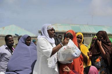| Keywords: outdoor The Deputy Head of AMISOM, Hon. Lydia Wanyoto hands over a paper bag containing clothes to a woman. This was during the distribution of items to less fortunate families around Wadajir district in Mogadishu, Somalia on July 05 2015. The items were donated by the Emirates Red Crescent and distributed by the African Union Mission in Somalia (AMISOM) . AMISOM Photo / Ilyas Ahmed The Deputy Head of AMISOM, Hon. Lydia Wanyoto hands over a paper bag containing clothes to a woman. This was during the distribution of items to less fortunate families around Wadajir district in Mogadishu, Somalia on July 05 2015. The items were donated by the Emirates Red Crescent and distributed by the African Union Mission in Somalia (AMISOM) . AMISOM Photo / Ilyas Ahmed |