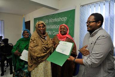 | Keywords: The Deputy Special Representative of the Chairperson of the African Union Commission (DSRCC) for Somalia, Lydia Wanyoto, hands a certificate of recognition to the Human Rights Activist, Sahra Mohamed Ahmed, during the Follow up Workshop on Validation of the AMISOM Gender Strategy held in Mogadishu, Somalia, on August 7, 2015. The workshop was organised and supported by AMISOM's Gender Unit. AMISOM Photo/Omar Abdisalan The Deputy Special Representative of the Chairperson of the African Union Commission (DSRCC) for Somalia, Lydia Wanyoto, hands a certificate of recognition to the Human Rights Activist, Sahra Mohamed Ahmed, during the Follow up Workshop on Validation of the AMISOM Gender Strategy held in Mogadishu, Somalia, on August 7, 2015. The workshop was organised and supported by AMISOM's Gender Unit. AMISOM Photo/Omar Abdisalan |