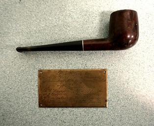 | Keywords: 1910s pipes minimalism Pipe and presentation plaque which reads: "Presented to A. W. Poole Sales Manager by Sales Staff McArthur Irwin Limited 1919 W. Reynolds R. B. Bremner | R. Sheppard A. J. Taylor | E. Nadon J. Geo. Marier | Chas. F. Richardson J. A. Trempe | J. E. Penfound" Pipe and presentation plaque which reads: "Presented to A. W. Poole Sales Manager by Sales Staff McArthur Irwin Limited 1919 W. Reynolds R. B. Bremner | R. Sheppard A. J. Taylor | E. Nadon J. Geo. Marier | Chas. F. Richardson J. A. Trempe | J. E. Penfound" |