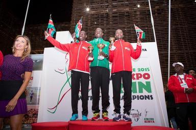 | Keywords: kenya italy milan expo 2015 traditional singing dancing song dance race marathon athletes runners run 3km 10km music celebration showcase world coffee nation tourism investment ITALY, Milan: In a photograph taken by Make It Kenya 10 September 2015, Thomas James Lokomwa (centre), winner of the men's Kenya Expo 'Run With The Champions' 10km race held at Expo Milan 2015, stands with second place Geoffrey Kiprono Ngetich (left) and third place Silas Muturi Gichovi (right) on the podium having received their trophies. The race, along with a family 3km fun-run which took place earlier in the day, was one of a number of events held in Milan this week to mark the Kenyan Week celebrations at Expo Milan 2015, a universal exhibition and platform for the exchange of ideas and shared solutions on the theme of food. MANDATORY CREDIT: MAKE IT KENYA PHOTO / STUART PRICE. ITALY, Milan: In a photograph taken by Make It Kenya 10 September 2015, Thomas James Lokomwa (centre), winner of the men's Kenya Expo 'Run With The Champions' 10km race held at Expo Milan 2015, stands with second place Geoffrey Kiprono Ngetich (left) and third place Silas Muturi Gichovi (right) on the podium having received their trophies. The race, along with a family 3km fun-run which took place earlier in the day, was one of a number of events held in Milan this week to mark the Kenyan Week celebrations at Expo Milan 2015, a universal exhibition and platform for the exchange of ideas and shared solutions on the theme of food. MANDATORY CREDIT: MAKE IT KENYA PHOTO / STUART PRICE. |