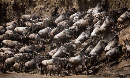 | Keywords: outdoor KENYA, Masai Mara: In a photograph taken by Make It Kenya 29 September 2015, a large group of wildebeest struggle to climb the wet, sandy bank of the Mara River having swam across it in Kenya's world famous Masai Mara National Reserve. Every year, hundreds of thousands of wildebeest, zebra and other ungulate animals migrate between Tanzania's Serengeti and Kenya's Masai Mara in a year-long, continuous cycle, which sees the animals travel thousands of kilometres and is known as one of the seven natural wonders of the world, and is a major draw for wildlife enthusiasts and tourists from around the world. MANDATORY CREDIT: MAKE IT KENYA PHOTO / STUART PRICE. KENYA, Masai Mara: In a photograph taken by Make It Kenya 29 September 2015, a large group of wildebeest struggle to climb the wet, sandy bank of the Mara River having swam across it in Kenya's world famous Masai Mara National Reserve. Every year, hundreds of thousands of wildebeest, zebra and other ungulate animals migrate between Tanzania's Serengeti and Kenya's Masai Mara in a year-long, continuous cycle, which sees the animals travel thousands of kilometres and is known as one of the seven natural wonders of the world, and is a major draw for wildlife enthusiasts and tourists from around the world. MANDATORY CREDIT: MAKE IT KENYA PHOTO / STUART PRICE. |