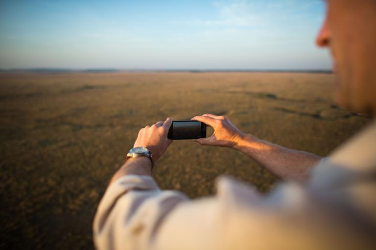 Keywords: KENYA, Masai Mara: In a photograph taken by Make It Kenya 02 October 2015, Andre Van Kets Co-founder of the website discoverafrica.com/herdtracker, and resource that tracks the annual wildebeest migration in Kenya's Masai Nara National Reserve and Tanzania's Serengeti, live-streams video over the internet via the Twitter application Periscope as a Governor's Balloon Safari floats along the course of the Mara River. Seeing the Mara from the air requires an early start in order to be airborne for the sunrise, but offers tourists visiting the famous wildlife reserve a unique and panoramic way to view one of Kenya's most famous natural attractions from the basket of a hot air balloon. MANDATORY CREDIT: MAKE IT KENYA PHOTO / STUART PRICE. KENYA, Masai Mara: In a photograph taken by Make It Kenya 02 October 2015, Andre Van Kets Co-founder of the website discoverafrica.com/herdtracker, and resource that tracks the annual wildebeest migration in Kenya's Masai Nara National Reserve and Tanzania's Serengeti, live-streams video over the internet via the Twitter application Periscope as a Governor's Balloon Safari floats along the course of the Mara River. Seeing the Mara from the air requires an early start in order to be airborne for the sunrise, but offers tourists visiting the famous wildlife reserve a unique and panoramic way to view one of Kenya's most famous natural attractions from the basket of a hot air balloon. MANDATORY CREDIT: MAKE IT KENYA PHOTO / STUART PRICE.