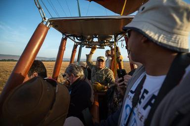| Keywords: KENYA, Masai Mara: In a photograph taken by Make It Kenya 02 October 2015, Sanjey Gupta, pilot with Governor's Balloon Safaris controls a hot air balloon as it floats along the course of the Mara River just before sunrise in Kenya's Masai Mara National Reserve. Seeing the Mara from the air requires an early start in order to be airborne for the sunrise, but offers tourists visiting the famous wildlife reserve a unique and panoramic way to view one of Kenya's most famous natural attractions from the basket of a hot air balloon. MANDATORY CREDIT: MAKE IT KENYA PHOTO / STUART PRICE. KENYA, Masai Mara: In a photograph taken by Make It Kenya 02 October 2015, Sanjey Gupta, pilot with Governor's Balloon Safaris controls a hot air balloon as it floats along the course of the Mara River just before sunrise in Kenya's Masai Mara National Reserve. Seeing the Mara from the air requires an early start in order to be airborne for the sunrise, but offers tourists visiting the famous wildlife reserve a unique and panoramic way to view one of Kenya's most famous natural attractions from the basket of a hot air balloon. MANDATORY CREDIT: MAKE IT KENYA PHOTO / STUART PRICE. |
