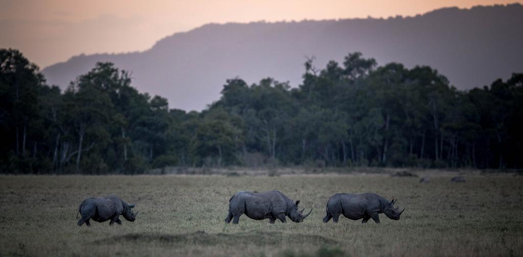 Keywords: outdoor landscape field grassland KENYA, Masai Mara: In a photograph taken by Make It Kenya 03 October 2015, three black rhino walk across an open area of grassland as dusk approaches in the Mara Triangle, part of Kenya's wider Masai Mara ecosystem. During the months of July through to October, one of nature's greatest events takes place in the Mara when hundreds of thousands of wildebeest, zebra and other ungulates migrate northwards from Tanzania's Serengeti in search of fresh pasture and grazing, before turning and heading south again in a journey that covers thousands of kilometres and is known as one of the seven natural wonders of the world, making it a major draw for wildlife enthusiasts and tourists from around the globe. MANDATORY CREDIT: MAKE IT KENYA PHOTO / STUART PRICE. KENYA, Masai Mara: In a photograph taken by Make It Kenya 03 October 2015, three black rhino walk across an open area of grassland as dusk approaches in the Mara Triangle, part of Kenya's wider Masai Mara ecosystem. During the months of July through to October, one of nature's greatest events takes place in the Mara when hundreds of thousands of wildebeest, zebra and other ungulates migrate northwards from Tanzania's Serengeti in search of fresh pasture and grazing, before turning and heading south again in a journey that covers thousands of kilometres and is known as one of the seven natural wonders of the world, making it a major draw for wildlife enthusiasts and tourists from around the globe. MANDATORY CREDIT: MAKE IT KENYA PHOTO / STUART PRICE.