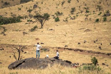| Keywords: outdoor KENYA, Masai Mara: In a photograph taken by Make It Kenya 04 October 2015, Carel Verhoef (left) and Andre Van Kets, co-founders of HerdTracker, prepare for a live broadcast on the Twitter application Periscope below the Oloololo Escarpment in the Mara Triangle, part of Kenya's wider Masai Mara ecosystem. During the months of July through to October, one of nature's greatest events takes place in the Mara when hundreds of thousands of wildebeest, zebra and other ungulates migrate northwards from Tanzania's Serengeti in search of fresh pasture and grazing, before turning and heading south again in a journey that covers thousands of kilometres and is known as one of the seven natural wonders of the world, making it a major draw for wildlife enthusiasts and tourists from around the globe. MANDATORY CREDIT: MAKE IT KENYA PHOTO / STUART PRICE. KENYA, Masai Mara: In a photograph taken by Make It Kenya 04 October 2015, Carel Verhoef (left) and Andre Van Kets, co-founders of HerdTracker, prepare for a live broadcast on the Twitter application Periscope below the Oloololo Escarpment in the Mara Triangle, part of Kenya's wider Masai Mara ecosystem. During the months of July through to October, one of nature's greatest events takes place in the Mara when hundreds of thousands of wildebeest, zebra and other ungulates migrate northwards from Tanzania's Serengeti in search of fresh pasture and grazing, before turning and heading south again in a journey that covers thousands of kilometres and is known as one of the seven natural wonders of the world, making it a major draw for wildlife enthusiasts and tourists from around the globe. MANDATORY CREDIT: MAKE IT KENYA PHOTO / STUART PRICE. |