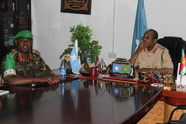| Keywords: The Force Commander of the African Union Mission in Somalia (AMISOM), Lt. Gen. Jonathan Rono (right) during the meeting with the Somali National Army (SNA) Chief of Defence Forces Maj. Gen. Mohamed Adan Ahmed (right) in Mogadishu, Somalia on October 27, 2015. AMISOM Photo / Raymond Baguma The Force Commander of the African Union Mission in Somalia (AMISOM), Lt. Gen. Jonathan Rono (right) during the meeting with the Somali National Army (SNA) Chief of Defence Forces Maj. Gen. Mohamed Adan Ahmed (right) in Mogadishu, Somalia on October 27, 2015. AMISOM Photo / Raymond Baguma |