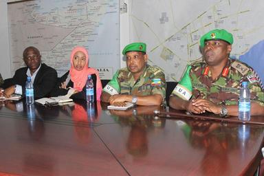| Keywords: The Force Commander of the African Union Mission in Somalia (AMISOM), Lt. Gen. Jonathan Rono (right), accompanied by the AMISOM Deputy Force Commander Maj. Gen. Mohammedesha Zeyinu (second from right) and other AMISOM officials during the meeting with the Somali National Army (SNA) Chief of Defence Forces Maj. Gen. Mohamed Adan Ahmed in Mogadishu, Somalia on October 27, 2015. AMISOM Photo / Raymond Baguma The Force Commander of the African Union Mission in Somalia (AMISOM), Lt. Gen. Jonathan Rono (right), accompanied by the AMISOM Deputy Force Commander Maj. Gen. Mohammedesha Zeyinu (second from right) and other AMISOM officials during the meeting with the Somali National Army (SNA) Chief of Defence Forces Maj. Gen. Mohamed Adan Ahmed in Mogadishu, Somalia on October 27, 2015. AMISOM Photo / Raymond Baguma |