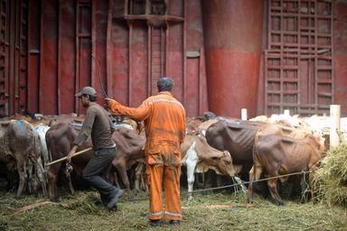 | Keywords: outdoor Cattle are hearded into a holding pen in the hold of a cargo ship in Mogadishu, Somalia, by the ship's crew on October 29. The cattle are ultimately destined for the port of Muscat, Oman, where they will be slaughtered and sold for their meat. AMISOM Photo / Tobin ones Cattle are hearded into a holding pen in the hold of a cargo ship in Mogadishu, Somalia, by the ship's crew on October 29. The cattle are ultimately destined for the port of Muscat, Oman, where they will be slaughtered and sold for their meat. AMISOM Photo / Tobin ones |