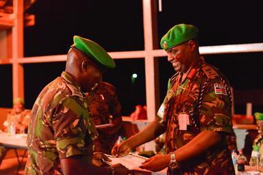 | Keywords: The Force Commander of the African Union Mission in Somalia (AMISOM), Lt. Gen. Jonathan Rono, hands a certificate to a Soldier from one of four Troop Contributing Countries (TCC) and one Mission Supporting Country (MSC), serving under African Union Mission in Somalia (AMISOM), during a farewell ceremony to mark the end of their tour of duty in Somalia on October 31, 2015. AMISOM Photo/Omar Abdisalann The Force Commander of the African Union Mission in Somalia (AMISOM), Lt. Gen. Jonathan Rono, hands a certificate to a Soldier from one of four Troop Contributing Countries (TCC) and one Mission Supporting Country (MSC), serving under African Union Mission in Somalia (AMISOM), during a farewell ceremony to mark the end of their tour of duty in Somalia on October 31, 2015. AMISOM Photo/Omar Abdisalann |