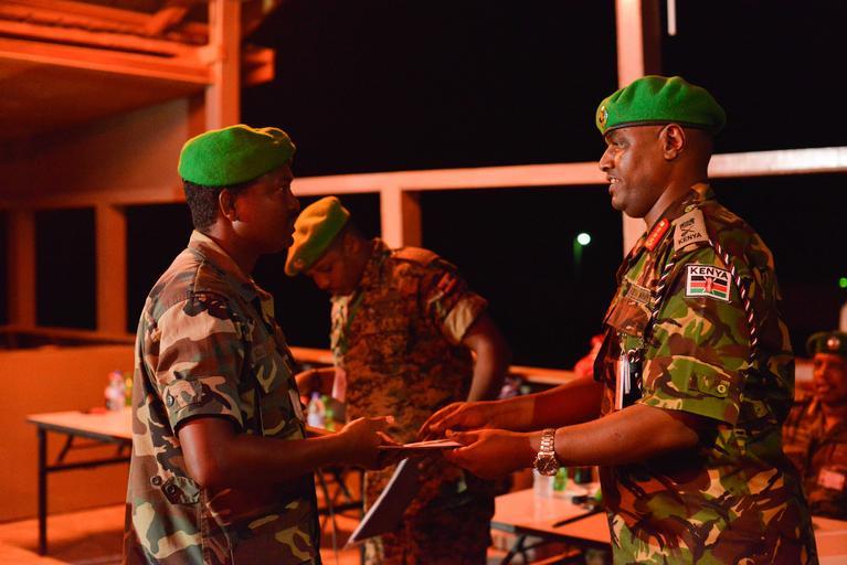 Keywords: The Force Commander of the African Union Mission in Somalia (AMISOM), Lt. Gen. Jonathan Rono, hands a certificate to a Soldier from one of four Troop Contributing Countries (TCC) and one Mission Supporting Country (MSC), serving under African Union Mission in Somalia (AMISOM), during a farewell ceremony to mark the end of their tour of duty in Somalia on October 31, 2015. AMISOM Photo/Omar Abdisalann The Force Commander of the African Union Mission in Somalia (AMISOM), Lt. Gen. Jonathan Rono, hands a certificate to a Soldier from one of four Troop Contributing Countries (TCC) and one Mission Supporting Country (MSC), serving under African Union Mission in Somalia (AMISOM), during a farewell ceremony to mark the end of their tour of duty in Somalia on October 31, 2015. AMISOM Photo/Omar Abdisalann