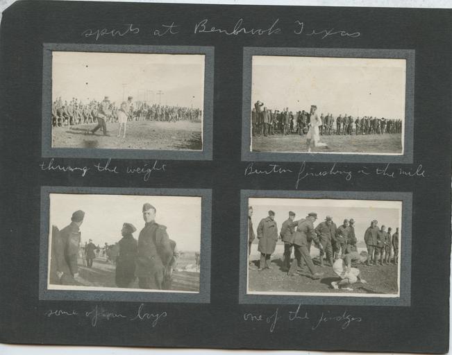 Keywords: 1910s world war i worldwari royal flying corps royalflyingcorps royal air force royalairforce sports athletics architecture window "Sports at Benbrook Texas" "throwing the weight" "Benton finishing in the mile" "some of our boys" "one of the judges" Photographs taken by Harry McBride (1893-1969), who worked as a rigger in the Royal Flying Corps and Royal Air Force during the First World War. He was stationed at Camp Mohawk near Deseronto, Ontario, and also at Camp Taliaferro near Fort Worth, Texas. Scanned images donated to the Archives by Dan McBride, Harry's grandson. "Sports at Benbrook Texas" "throwing the weight" "Benton finishing in the mile" "some of our boys" "one of the judges" Photographs taken by Harry McBride (1893-1969), who worked as a rigger in the Royal Flying Corps and Royal Air Force during the First World War. He was stationed at Camp Mohawk near Deseronto, Ontario, and also at Camp Taliaferro near Fort Worth, Texas. Scanned images donated to the Archives by Dan McBride, Harry's grandson. |