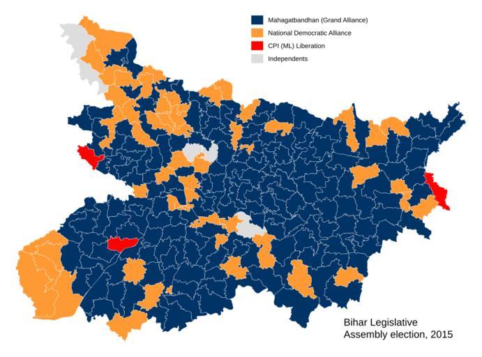 | Keywords: 2015 Bihar election result by alliance.svg en A map showing the results of the Bihar Legislative Assembly election 2015 2015-11-08 own Created using data from http //gisserver1 nic in/ecimaps/Biharac aspx Nirinsanity other versions 2015 Bihar election result by alliance Tamil svg Tamil version cc-zero Election maps of Bihar Uploaded with UploadWizard |