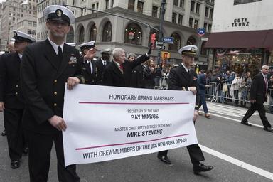 | Keywords: 2015 Veterans Day parade 151111-N-LV331-002.jpg en 151111-N-LV331-002 NEW YORK Nov 11 2015 Honorary grand marshals of the 2015 Veterans Day parade Secretary of the Navy SECNAV Ray Mabus and Master Chief Petty Officer of the Navy MCPON Mike Stevens wave to New Yorkers as they march with Sailors down 5th Avenue Mabus and the crew of USS New York LPD 21 joined more than 400 local Sailors in marching down 5th avenue to represent the U S Navy as the featured service for this year's parade U S Navy photo by Mass Communication Specialist 2nd Class Armando Gonzales/Released Unit Navy Media Content Services DVIDS Tags Secretary of the Navy; Ray Mabus; power; travel; budget; presence; partnerships; spending; Navy; people; government; SECNAV; Marine Corps; NMCS; DVIDS Bulk Import 2015-11-11 Armando Gonzales https //www dvidshub net/image/2293084/2015-veterans-day-parade 151111-N-LV331-002 2015-11-18 00 21 NEW YORK NY US PD-USGov-Military-Navy Ray Mabus Veterans Day 2015 USS New York LPD-21 Images from DoD uploaded by Fæ |