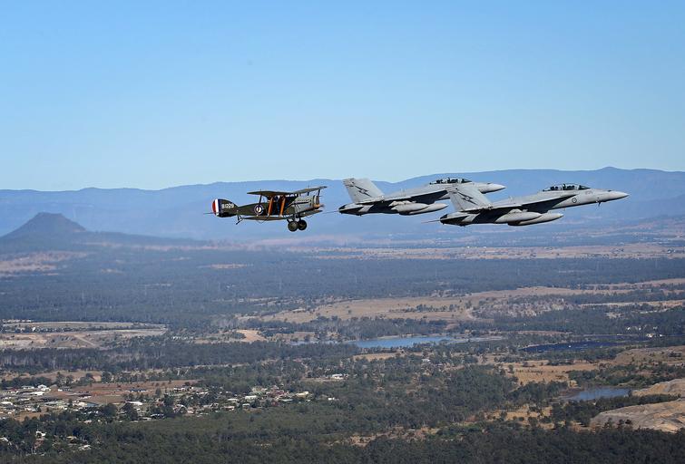 | Keywords: royal australian air force royalaustralianairforce air-to-air airtoair aircraft a44 f/a-18f super hornet a44fa18fsuperhornet raaf base amberley raafbaseamberley queensland australia aus outdoor A formation flight with No 1 Squadron (1SQN) F/A-18F Super Hornets and a Bristol F2B Fighter (aircraft flown by 1SQN in World War 1) commemorates the SQN’s Centenary and marked 1SQN's first operational sorties on 12 June 1916. The Bristol F2B Fighter was provided by TAVAS (WWI vintage aircraft society) and flown by Jack McDonald. The Bristol was painted in WWI-era 1SQN colours and had the tail number B1229. The tail number was flown by Ross McPherson Smith who achieved 10 of his 11 victories in this aircraft. A formation flight with No 1 Squadron (1SQN) F/A-18F Super Hornets and a Bristol F2B Fighter (aircraft flown by 1SQN in World War 1) commemorates the SQN’s Centenary and marked 1SQN's first operational sorties on 12 June 1916. The Bristol F2B Fighter was provided by TAVAS (WWI vintage aircraft society) and flown by Jack McDonald. The Bristol was painted in WWI-era 1SQN colours and had the tail number B1229. The tail number was flown by Ross McPherson Smith who achieved 10 of his 11 victories in this aircraft. |