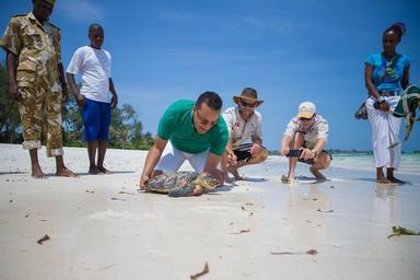 | Keywords: outdoor KENYA, Watamu: In a photograph taken by Make It Kenya 17 January 2016, Kenya's Cabinet Secretary for Tourism Hon. Najib Balala (in green shirt) releases a Hawksbill turtle back into the Indian Ocean, which had been rehabilitated by the Local Ocean Trust. Balala arrived in the coastal town of Watamu by parachute this morning after skydiving out of a plane from approx. 11,000ft. Kenya's famous wildlife and beautiful tropical coastline is being showcased in a series of live web broadcasts using state-of–the-art technology. #KenyaLive has enabled people to witness the excitement of a night safari in the Mara in real time using specialist night-vision equipment and is now in Watamu highlighting the work of the turtle conservation organisation Local Ocean Trust, and other activities including stand-up paddle boarding with dolphins, snorkelling and scuba diving by using the scial media application Periscope. MAKE IT KENYA PHOTO / STUART PRICE. KENYA, Watamu: In a photograph taken by Make It Kenya 17 January 2016, Kenya's Cabinet Secretary for Tourism Hon. Najib Balala (in green shirt) releases a Hawksbill turtle back into the Indian Ocean, which had been rehabilitated by the Local Ocean Trust. Balala arrived in the coastal town of Watamu by parachute this morning after skydiving out of a plane from approx. 11,000ft. Kenya's famous wildlife and beautiful tropical coastline is being showcased in a series of live web broadcasts using state-of–the-art technology. #KenyaLive has enabled people to witness the excitement of a night safari in the Mara in real time using specialist night-vision equipment and is now in Watamu highlighting the work of the turtle conservation organisation Local Ocean Trust, and other activities including stand-up paddle boarding with dolphins, snorkelling and scuba diving by using the scial media application Periscope. MAKE IT KENYA PHOTO / STUART PRICE. |