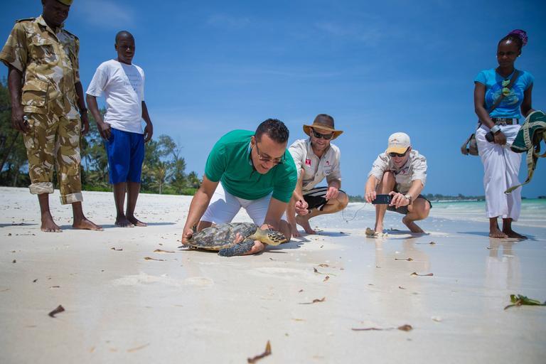 Keywords: outdoor KENYA, Watamu: In a photograph taken by Make It Kenya 17 January 2016, Kenya's Cabinet Secretary for Tourism Hon. Najib Balala (in green shirt) releases a Hawksbill turtle back into the Indian Ocean, which had been rehabilitated by the Local Ocean Trust. Balala arrived in the coastal town of Watamu by parachute this morning after skydiving out of a plane from approx. 11,000ft. Kenya's famous wildlife and beautiful tropical coastline is being showcased in a series of live web broadcasts using state-of–the-art technology. #KenyaLive has enabled people to witness the excitement of a night safari in the Mara in real time using specialist night-vision equipment and is now in Watamu highlighting the work of the turtle conservation organisation Local Ocean Trust, and other activities including stand-up paddle boarding with dolphins, snorkelling and scuba diving by using the scial media application Periscope. MAKE IT KENYA PHOTO / STUART PRICE. KENYA, Watamu: In a photograph taken by Make It Kenya 17 January 2016, Kenya's Cabinet Secretary for Tourism Hon. Najib Balala (in green shirt) releases a Hawksbill turtle back into the Indian Ocean, which had been rehabilitated by the Local Ocean Trust. Balala arrived in the coastal town of Watamu by parachute this morning after skydiving out of a plane from approx. 11,000ft. Kenya's famous wildlife and beautiful tropical coastline is being showcased in a series of live web broadcasts using state-of–the-art technology. #KenyaLive has enabled people to witness the excitement of a night safari in the Mara in real time using specialist night-vision equipment and is now in Watamu highlighting the work of the turtle conservation organisation Local Ocean Trust, and other activities including stand-up paddle boarding with dolphins, snorkelling and scuba diving by using the scial media application Periscope. MAKE IT KENYA PHOTO / STUART PRICE.