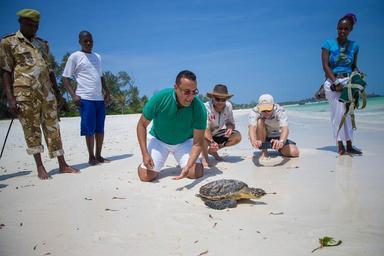 | Keywords: outdoor KENYA, Watamu: In a photograph taken by Make It Kenya 17 January 2016, Kenya's Cabinet Secretary for Tourism Hon. Najib Balala (in green shirt) releases a Hawksbill turtle back into the Indian Ocean, which had been rehabilitated by the Local Ocean Trust. Balala arrived in the coastal town of Watamu by parachute this morning after skydiving out of a plane from approx. 11,000ft. Kenya's famous wildlife and beautiful tropical coastline is being showcased in a series of live web broadcasts using state-of–the-art technology. #KenyaLive has enabled people to witness the excitement of a night safari in the Mara in real time using specialist night-vision equipment and is now in Watamu highlighting the work of the turtle conservation organisation Local Ocean Trust, and other activities including stand-up paddle boarding with dolphins, snorkelling and scuba diving by using the scial media application Periscope. MAKE IT KENYA PHOTO / STUART PRICE. KENYA, Watamu: In a photograph taken by Make It Kenya 17 January 2016, Kenya's Cabinet Secretary for Tourism Hon. Najib Balala (in green shirt) releases a Hawksbill turtle back into the Indian Ocean, which had been rehabilitated by the Local Ocean Trust. Balala arrived in the coastal town of Watamu by parachute this morning after skydiving out of a plane from approx. 11,000ft. Kenya's famous wildlife and beautiful tropical coastline is being showcased in a series of live web broadcasts using state-of–the-art technology. #KenyaLive has enabled people to witness the excitement of a night safari in the Mara in real time using specialist night-vision equipment and is now in Watamu highlighting the work of the turtle conservation organisation Local Ocean Trust, and other activities including stand-up paddle boarding with dolphins, snorkelling and scuba diving by using the scial media application Periscope. MAKE IT KENYA PHOTO / STUART PRICE. |