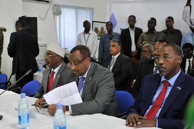 | Keywords: people The President of Interim South West Administration, Sharif Hassan Sheikh Adan, the President of Puntland, Abdiwali Mohamed Ali Gas, and the Galmudug Interim President, Abdikarim Hussein Guled, attend a meeting with members of the United Nations Security Council during their visit to Mogadishu, Somalia, on May 19, 2016. AMISOM Photo/ Omar Abdisalan The President of Interim South West Administration, Sharif Hassan Sheikh Adan, the President of Puntland, Abdiwali Mohamed Ali Gas, and the Galmudug Interim President, Abdikarim Hussein Guled, attend a meeting with members of the United Nations Security Council during their visit to Mogadishu, Somalia, on May 19, 2016. AMISOM Photo/ Omar Abdisalan |