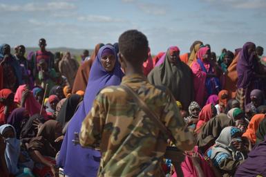 | Keywords: outdoor Soldiers from the Somali National Army stand watch as women wait at an IDP camp near the town of Beletweyne, Somalia, for a food handout by the Djiboutian government on May 29, 2016. Flooding in the Hiraan region of Somalia has led to the displacement of 17,000 people so far and is the worst to hit the region since 1981. AMISOM Photo / Tobin Jones Soldiers from the Somali National Army stand watch as women wait at an IDP camp near the town of Beletweyne, Somalia, for a food handout by the Djiboutian government on May 29, 2016. Flooding in the Hiraan region of Somalia has led to the displacement of 17,000 people so far and is the worst to hit the region since 1981. AMISOM Photo / Tobin Jones |