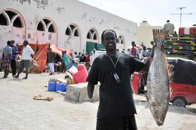 | Keywords: outdoor A disabled man holds a fish in Hamarweyne market in Mogadishu, Somalia on July 04, 2016 ahead of Eid el-Fitr celebrations. AMISOM Photo / Ilyas Ahmed A disabled man holds a fish in Hamarweyne market in Mogadishu, Somalia on July 04, 2016 ahead of Eid el-Fitr celebrations. AMISOM Photo / Ilyas Ahmed |
